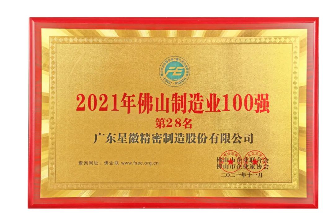 2021年11月20日,由佛山市企業聯合會、佛山市企業家協會主辦的2021年佛山市企業家活動日暨佛山企業100強、制造業100強企業發布會順利舉行。會上發布了佛山雙百強榜單,憑借強勁的綜合實力和品牌影響力,星徽精密榮登“2021年佛山企業100強“第56名、“2021年佛山制造業100強”第28名,在家居五金企業中排名位列第一。