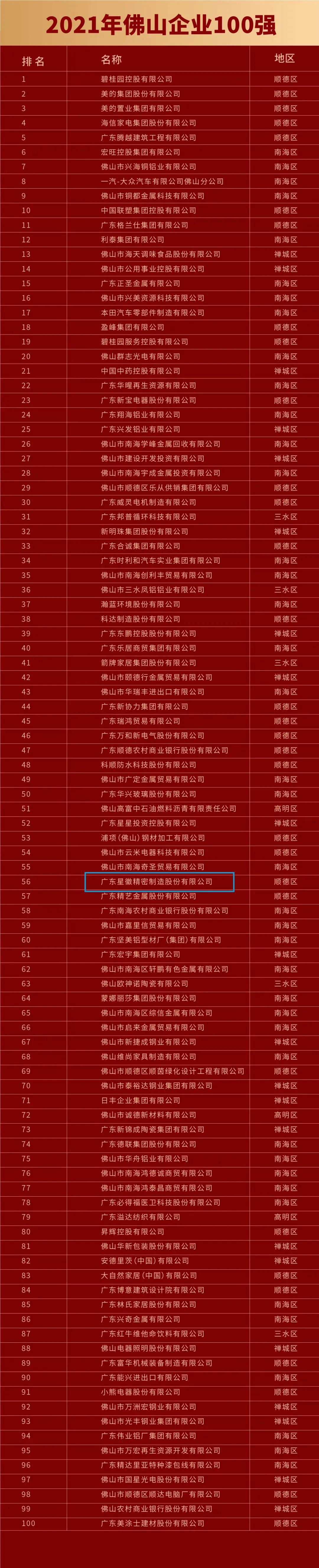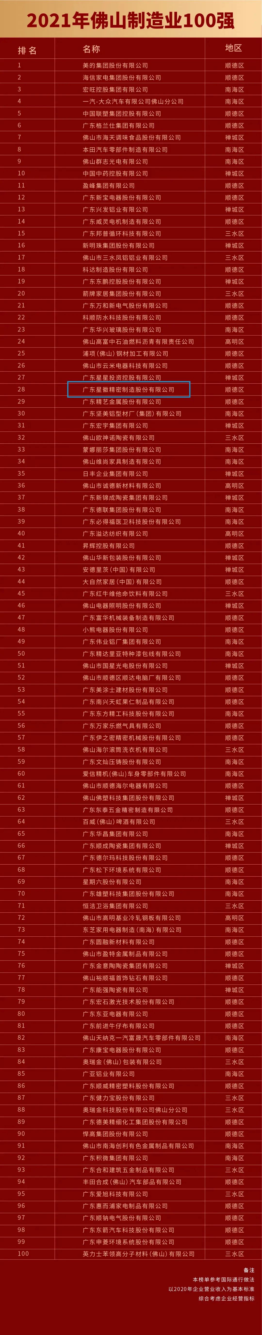 “佛山企業100強”榜單和“佛山制造業100強”榜單參照世界500強、中國企業500強、廣東企業500強等榜單的評選方式,評比過程權威、公正、公開,也得到了社會各界的高度認可。相比較去年星徽精密今年排名上升23位,進一步確立了星徽精密在行業中的領先地位。