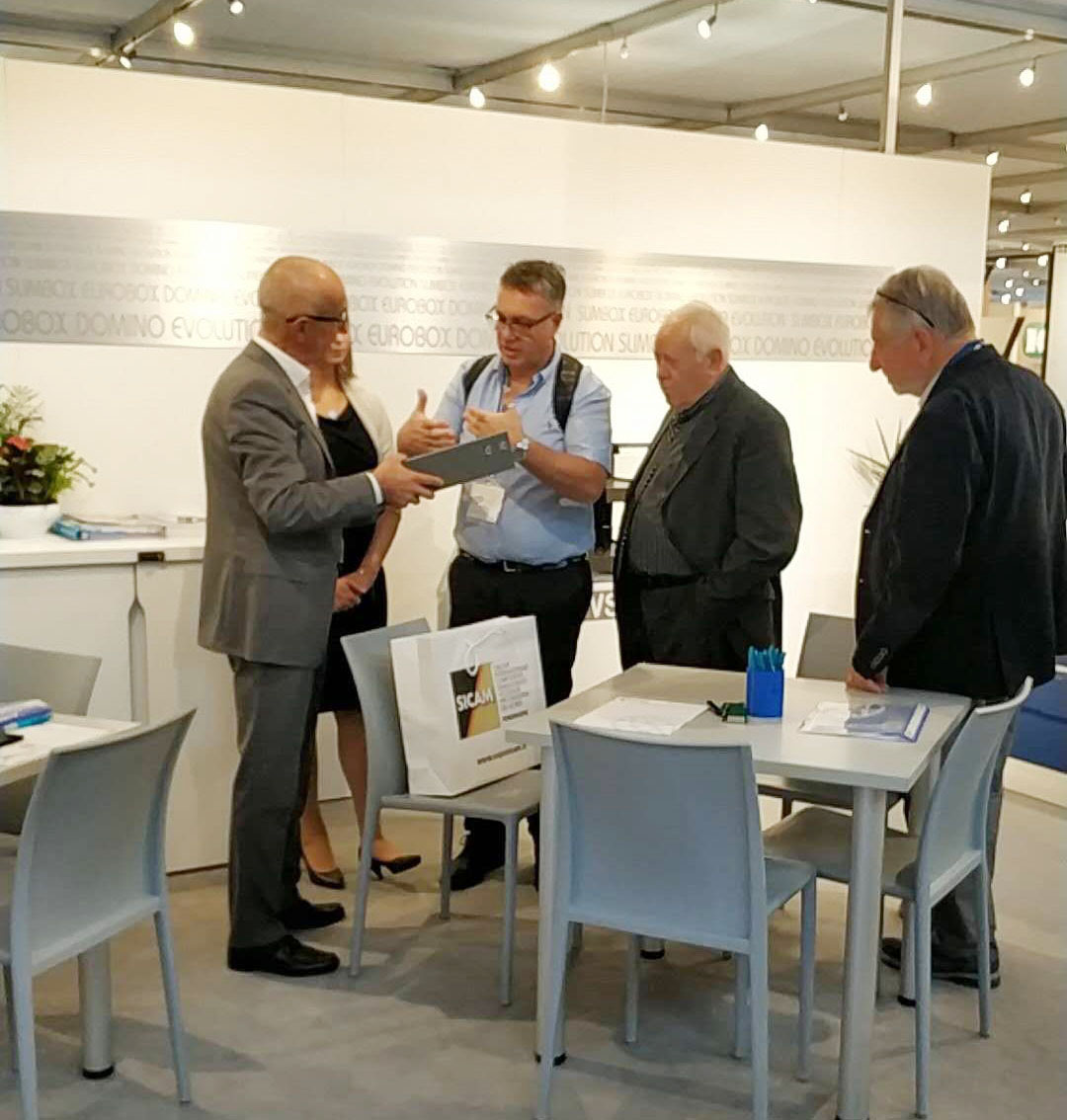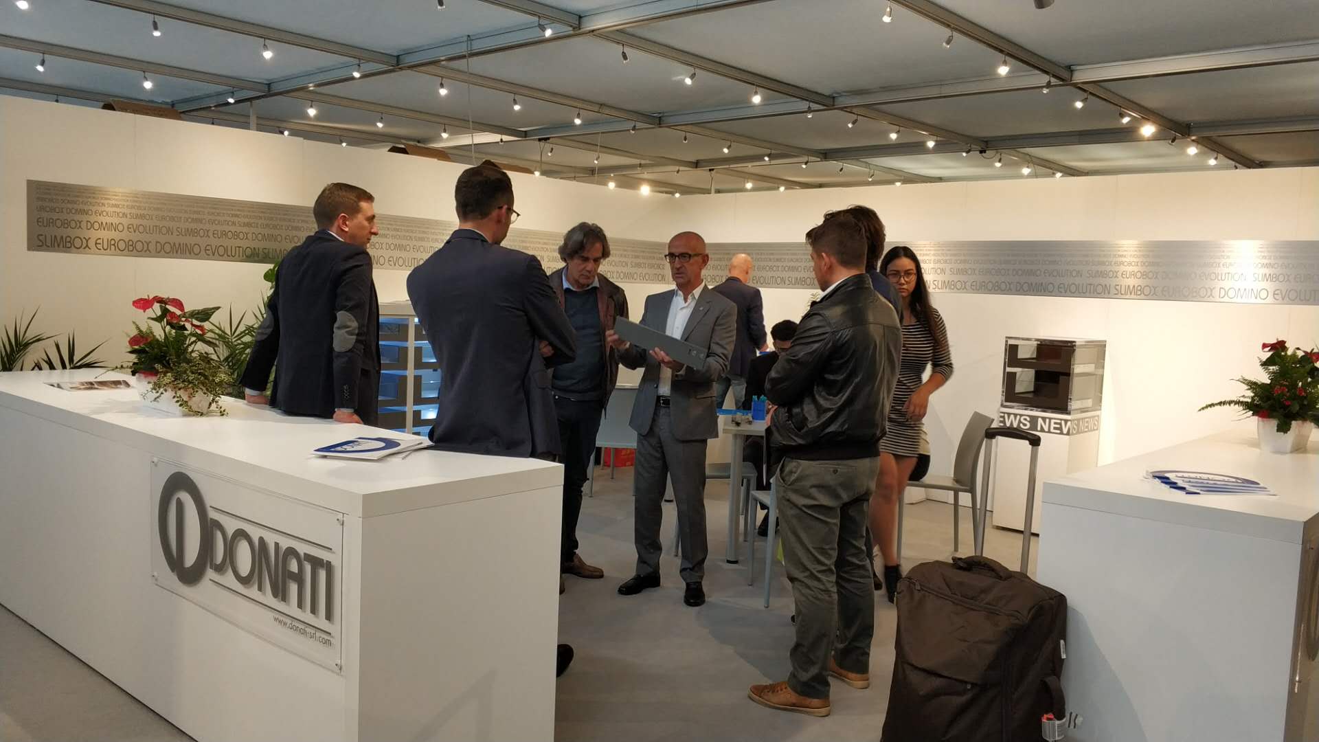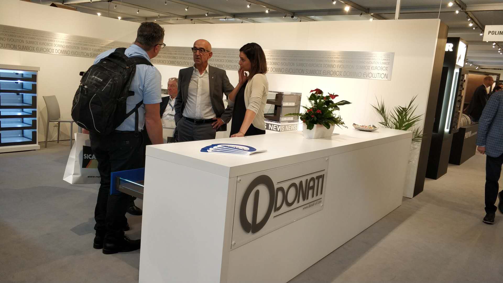 2018年10月16日,為期4天的意大利SICAM 秋季家具材料展會在威尼斯的博德諾內召開,星徽子公司意大利DONATI以一系列歐洲先進技術的產品線精彩亮相。展位以簡潔的白色搭配銀色點綴,整個展位時尚簡約,注重客戶體驗的展廳設計,讓客戶在每個不同角落,都可以體驗到DONATI創新產品的真實感受。