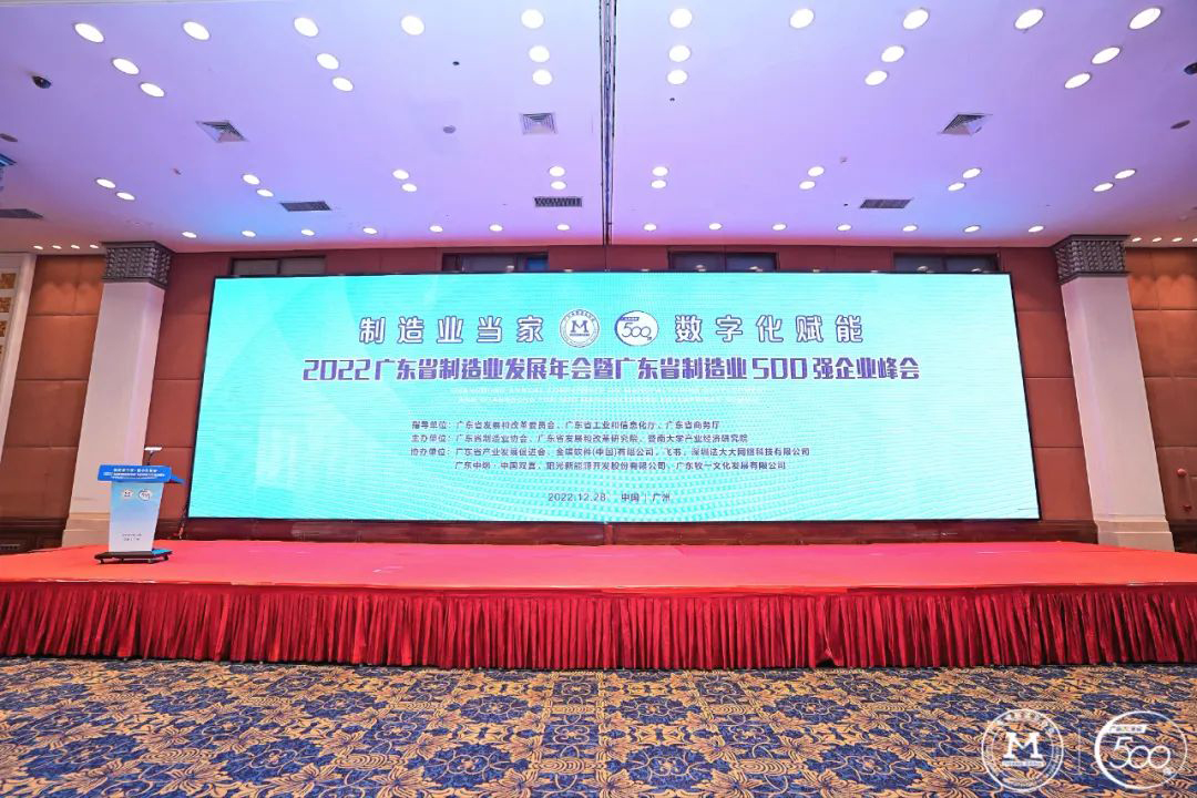 12月28日,2022廣東省制造業發展年會暨廣東省制造業500強企業峰會在廣州東方賓館舉行,此次大會由廣東省制造業協會/廣東省產業發展促進會主辦,500強企業代表人士和省商務廳、發改局、暨南大學等相關單位領導濟濟一堂,共同參加了此次盛會。